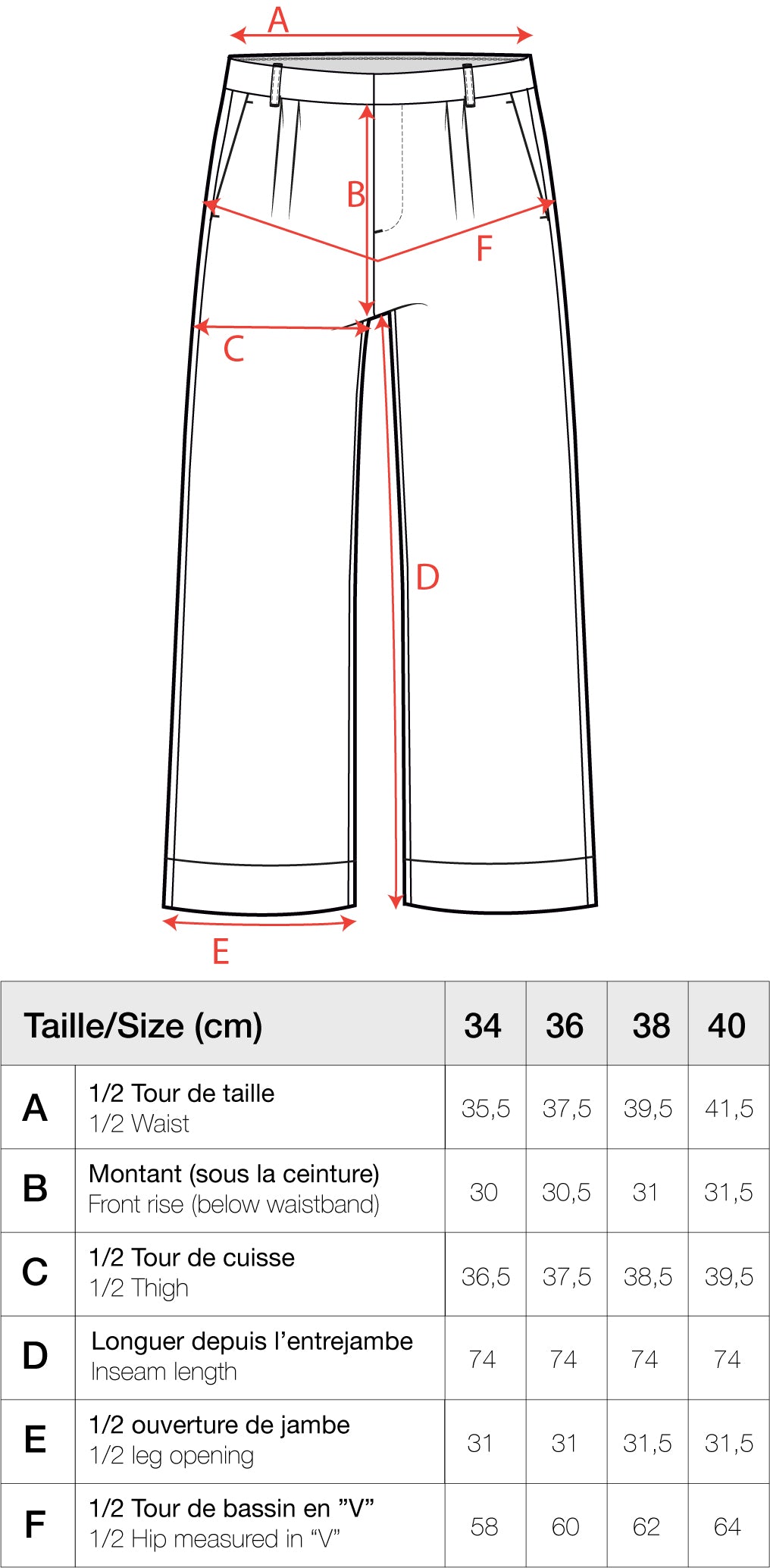 Pour des mesures complètes, nous vous invitons à vous référer au guide des tailles et à comparer avec un de vos pantalons dont la taille vous convient.