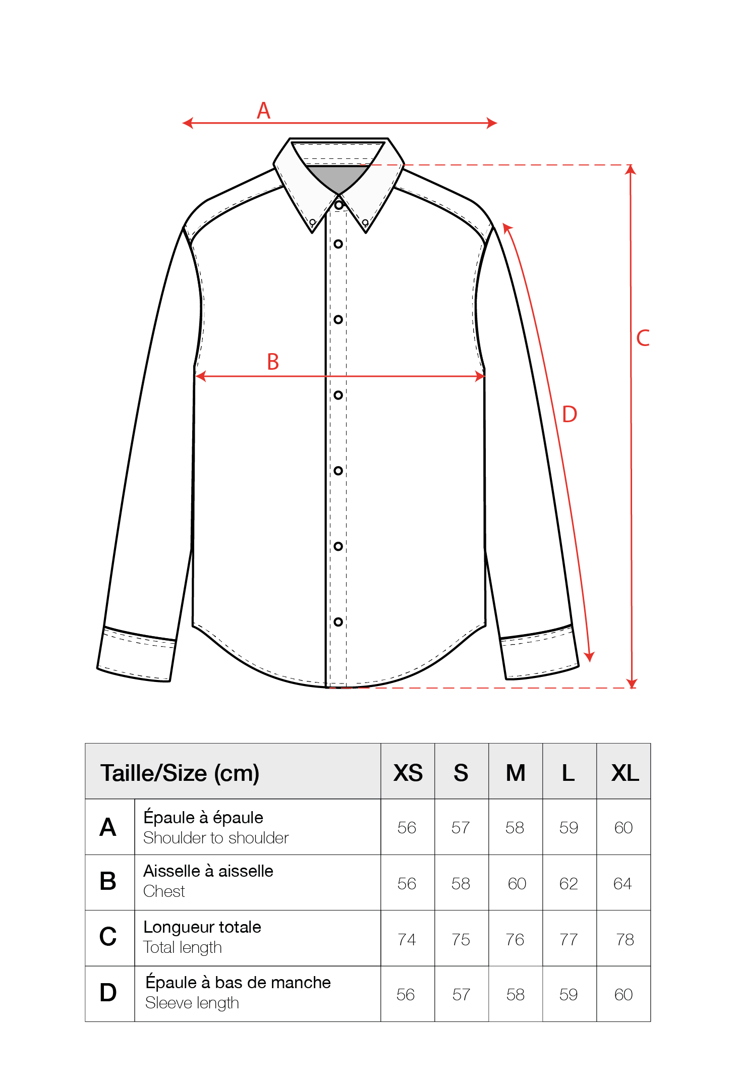 Notre mannequin José mesure 1m80 et porte une taille M. Nous vous recommandons de prendre votre taille habituelle. Pour des mesures complètes, nous vous invitons à vous référer au guide des tailles et à comparer avec une de vos chemises dont la taille vous convient.