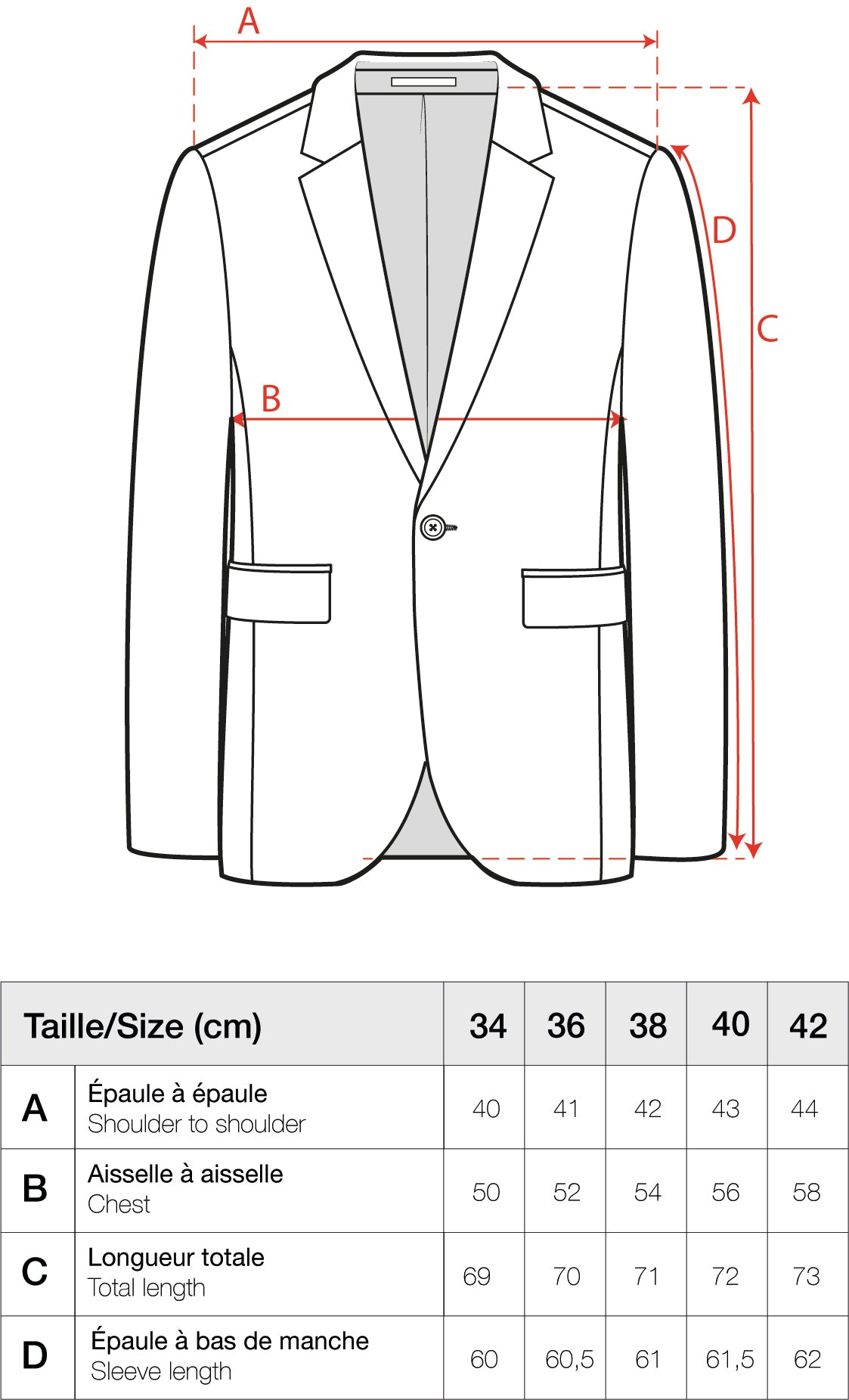 Nous vous invitons à prendre voter taille habituelle. Pour des mesures complètes, nous vous invitons à vous référer au guide des tailles et à comparer avec une de vos vestes dont la taille vous convient.