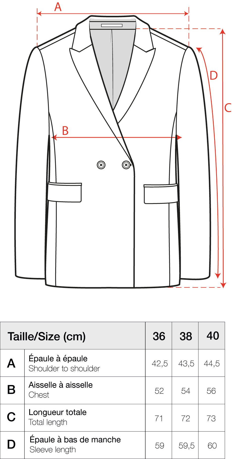 Nous vous invitons à prendre voter taille habituelle. Pour des mesures complètes, nous vous invitons à vous référer au guide des tailles et à comparer avec une de vos vestes dont la taille vous convient.